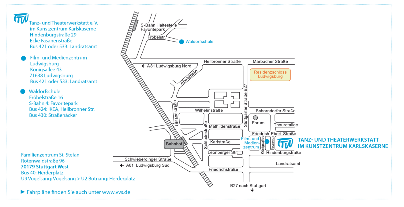 vom Ludwigsburger Busbahnhof in die Leonberger Straße einbiegen und immer auf die Friedenskirche zugehen. Links an der Friedenskirche vorbei und die B27 durch die Unterführung unterqueren. Dann in die Hindenburgstraße links abbiegen. Nach 300m (nach der Fasanenstraße) ist der Hofeingang links.